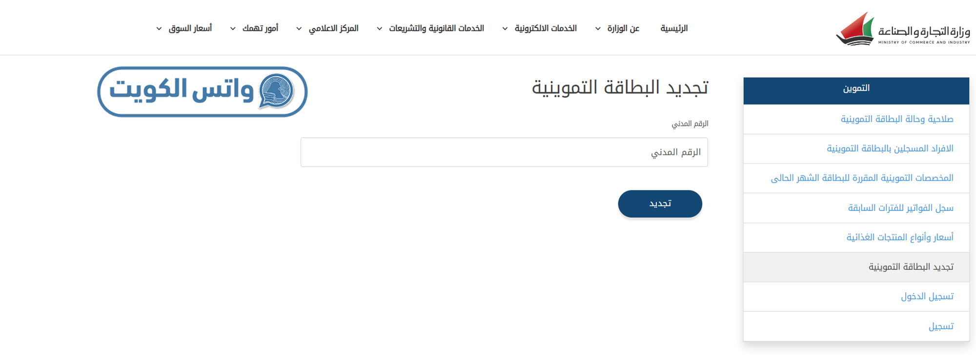 ترتبط خدمة تجديد البطاقة التموينية مع الرقم المدني للمواطن الكويتي، وهي من الخدمات التي توفرها وزارة التجارة والصناعة عبر موقعها الإلكتروني الرسمي على شبكة الإنترنت دون الحاجة إلى تسجيل الدخول في حساب المواطن على بوابة استقبال طلبات المراجعين أو أية منصات أخرى.